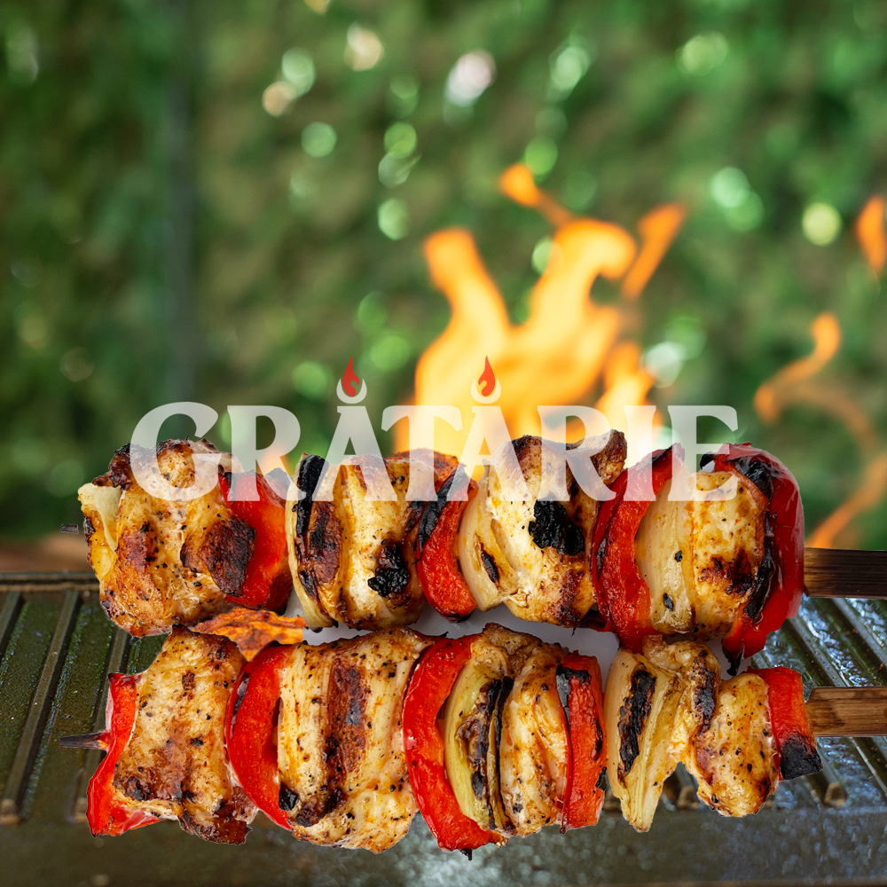 Pregătite din mușchiuleț de la pieptul de pui, care se condimenteaza cu 4 ingrediente, apoi se așeasă pe frigare alături de ceapă roșie și ardei gras roșu, este ideal pentru copii, alături de cartofi prăjiți și sos.
